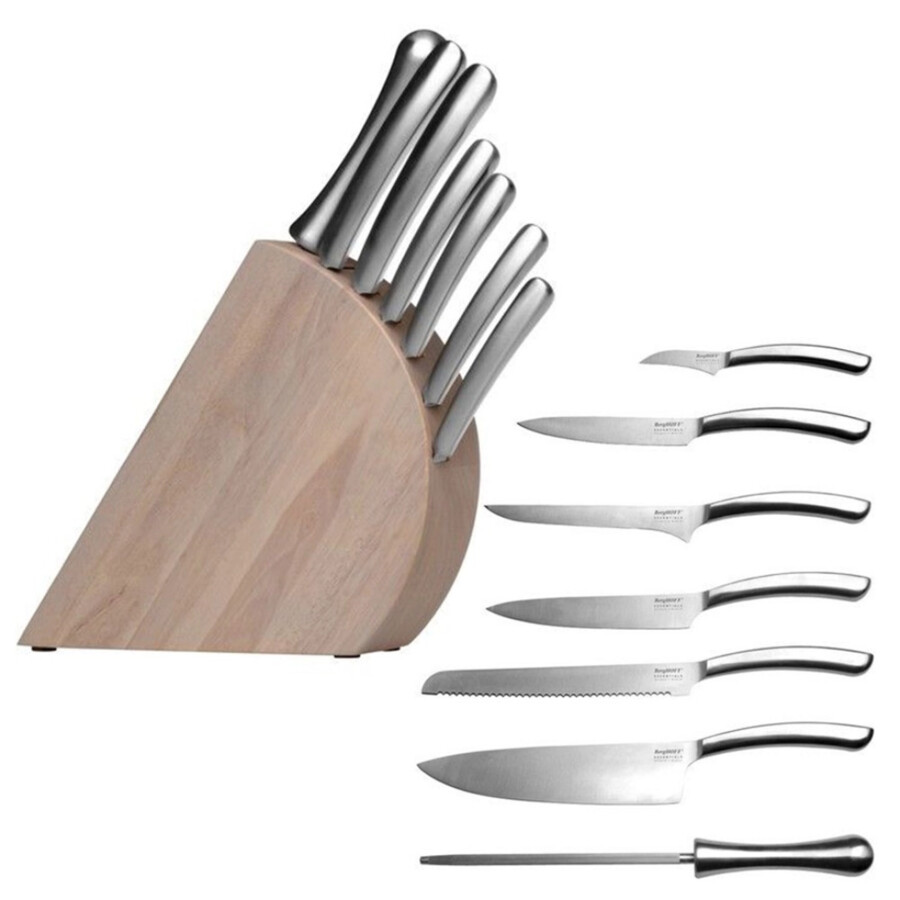 Этот красивый серебристый набор от всемирно известного бренда Berghoff из линейки Concavo станет для вас прекрасным помощником на кухне. Состоит из мусата, колоды и 6 ножей - для хлеба (со специальным зазубренным лезвием), а также обвалочный, поварской, универсальные.