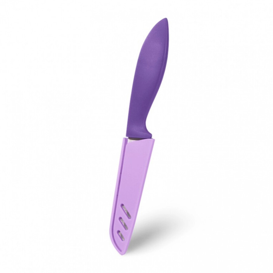 Это нож для очистки овощей, которыяй изготовлен из высококачественной стали. Оснащен яркой пластиковой рукояткой. В комплект входит чехол на лезвие, обеспечивающий безопасное хранение.