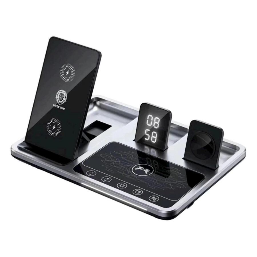 Зарядное устройство Green Lion 4 в 1 — очень важная зарядная станция, поскольку вам нужно ограниченное количество кабелей и подключаемый модуль для одновременной зарядки всех ваших устройств. Кроме того, теперь вы можете быстро заряжать свой iPhone, Apple Watch и AirPods с помощью этой зарядной станции, при этом каждое устройство получает выходную мощность 15 Вт, 2,5 Вт и 5 Вт соответственно. Кроме того, надежные системы защиты этого продукта защищают ваш смартфон от перезарядки и перегрева. Благодаря интеллектуальной микросхеме он обеспечивает зарядку вашего смартфона оптимальным зарядным током. Наконец, ваш рабочий стол теперь аккуратен и организован благодаря этой зарядной станции, где цифровые часы являются отличительным и полезным дополнением.