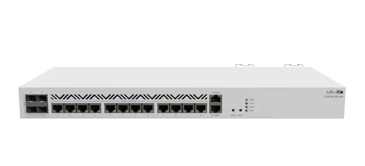 Маршрутизатор Mikrotik CCR2116-12G-4S+ - производительный маршрутизатор, оснащенный 16-ядерным процессором ARM AL73400 @ 2 GHz, 16 Gb RAM, 13 портами RJ45 1 Gbps, 4 портами SFP+ 10 Gbps, консольным портом RJ45, слотом M.2 PCIe, 2 встроенными блоками питания. Работает под управлением RouterOS Level 6. Конструктивно предусматривает монтаж в 19" телекоммуникационную стойку / шкаф.