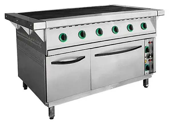 Электрическая плита Пищевые Технологии ПЭП-0,72-ДШ-01 предназначена для приготовления первых, вторых и третьих блюд в наплитной посуде на предприятиях общественного питания и торговли. Модель оснащена жарочным шкафом с раздельной регулировкой мощности верхнего и нижнего ТЭНов, аварийным предохранителем от перегрева и регулируемыми по высоте ножками. Лицевая и верхняя части корпуса выполнены из нержавеющей стали, остальные части - из оцинкованной стали.