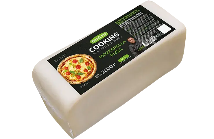 Полутвердый сыр Mozzarella Pizza ТМ Cooking – сыр группы Паста Филата – наилучшим образом раскрывает свои вкусовые качества под воздействием температуры: в результате при приготовлении пиццы обеспечивается равномерное покрытие соуса, образование аппетитных блистеров золотистого и светло-коричневого цвета, сыр легко тянется. Массовая доля жира в сухом веществе 42 %.