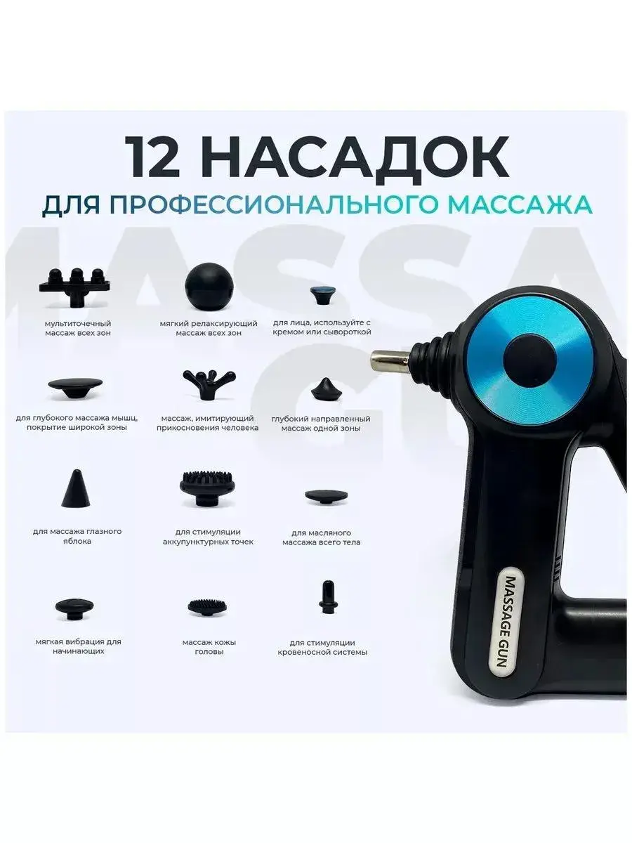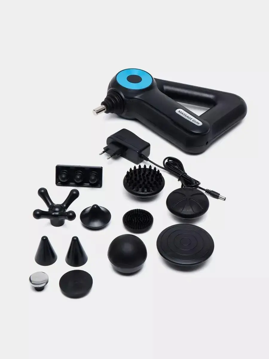 Аккумуляторный пистолет для массажа имеет 12 насадок разных форм.