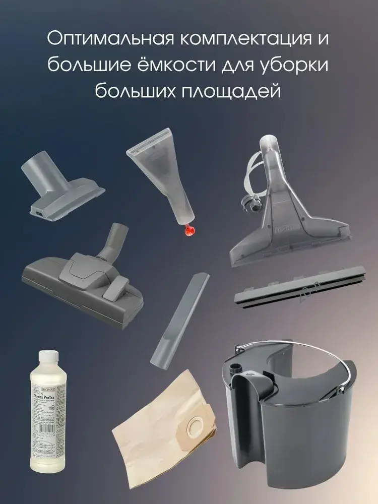 Пылесос оснащён встроенным баком для чистой воды объёмом 3,6 литра и контейнером на 20 литров для сбора сухой и влажной грязи, что делает его отличным выбором для уборки больших площадей без частой замены воды.