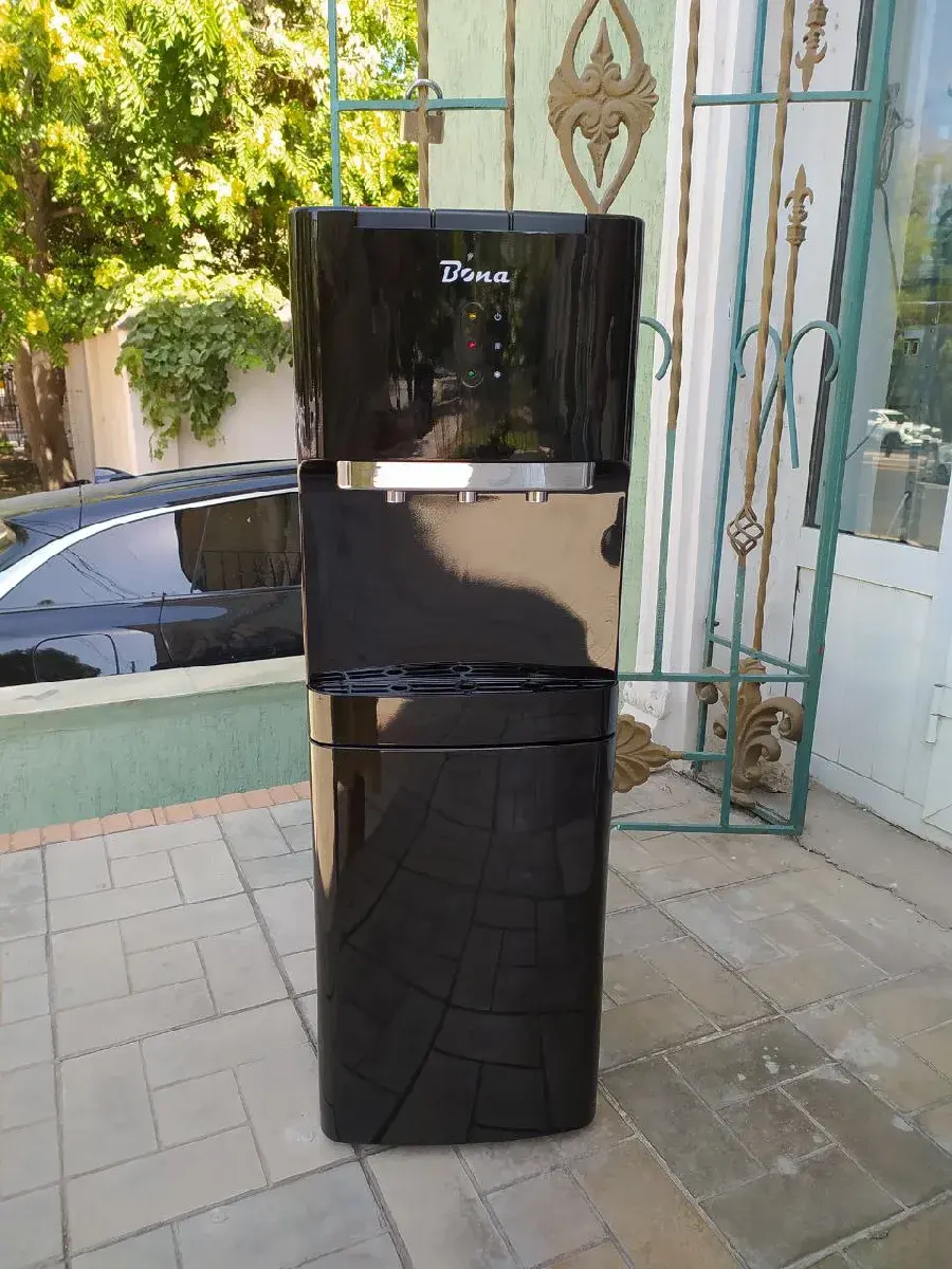 Напольный (черный), нагрев +95ºС, фреоновое охлаждение +5С, со встроенным шкафчиком, подача воды кнопками (горячая, холодная, комнатная температура), защита от детей.