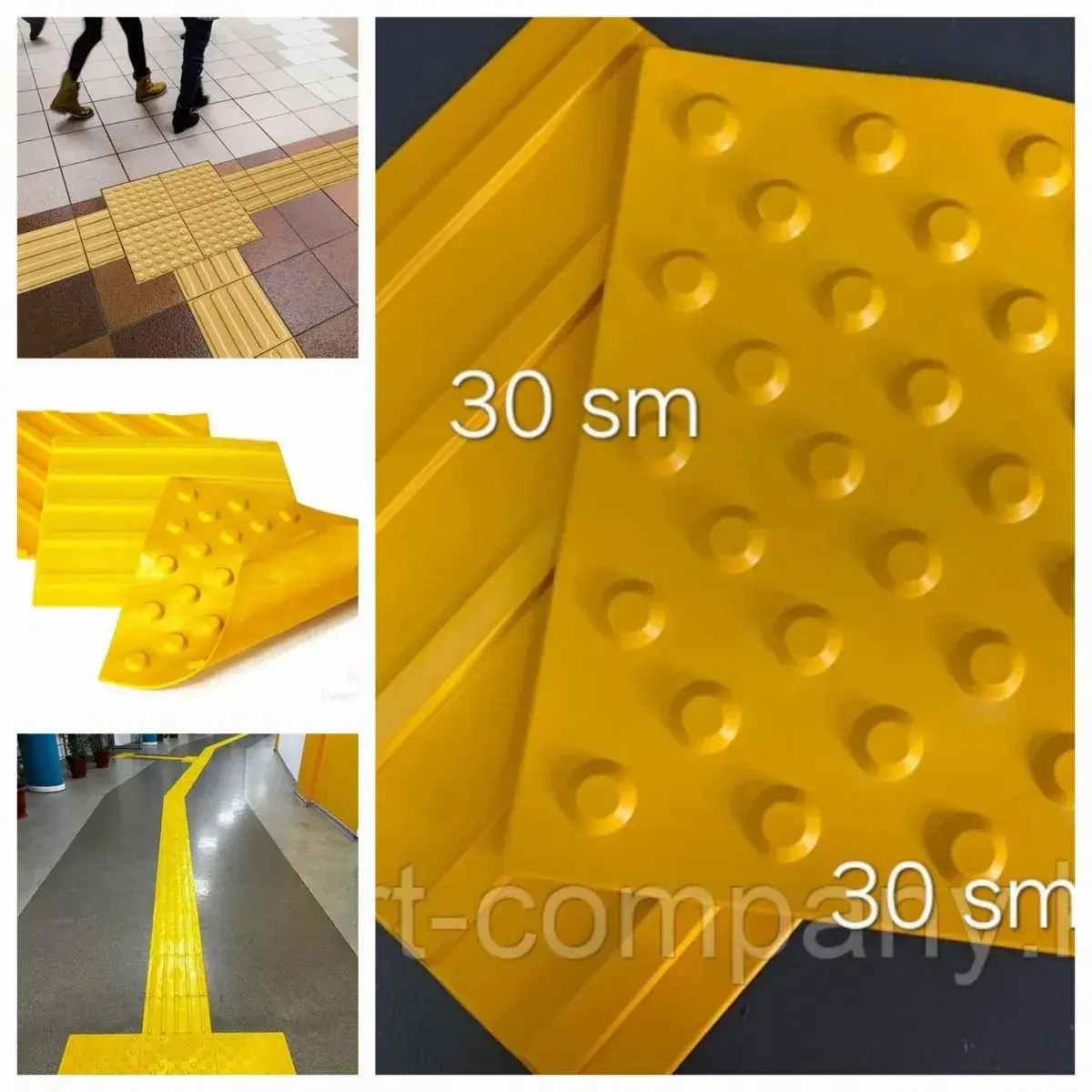 Тактильная плитка имеет размеры 30х30 и предназначена для прохода слепых.