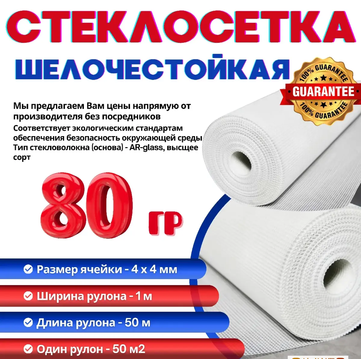 Подробное описание: Стеклосетка фасадная 80гр 1м х 50м