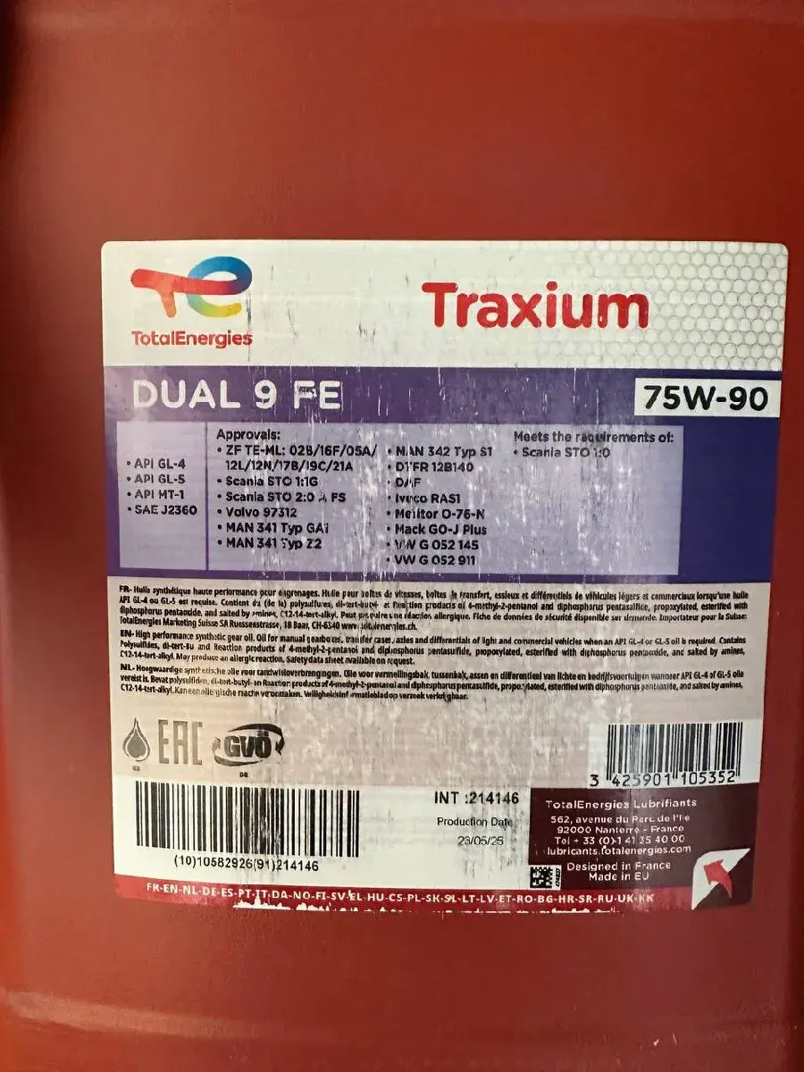 TOTAL TRAXIUM DUAL 9 FE 75W-90 подходит для применения в трансмиссиях таких концернов как MACK, MAN, DAF, IVECO, MERCEDES, VOLVO, RENAULT с увеличенными интервалами замены.