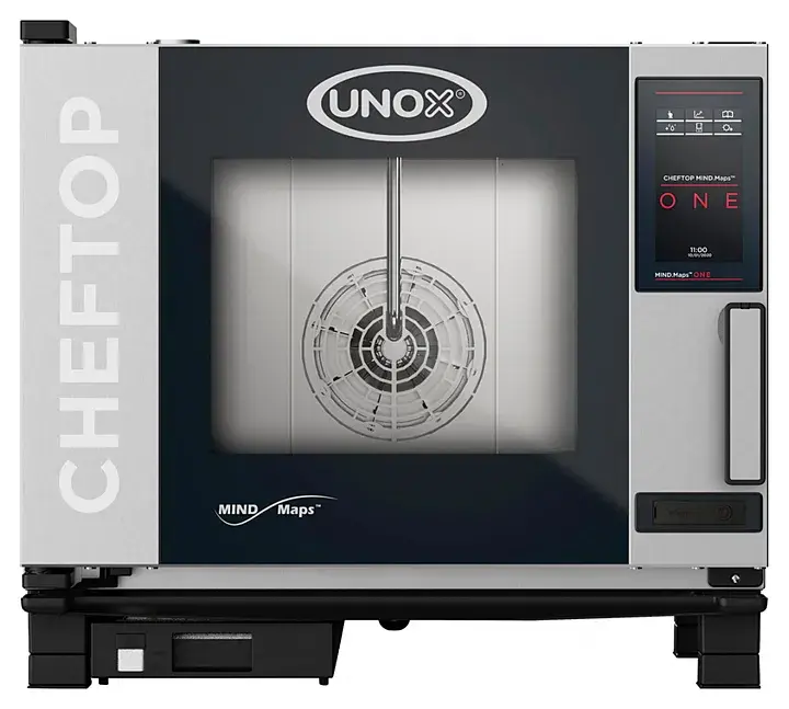 Пароконвектомат UNOX XEVC-0511-E1RM серии CHEFTOP MIND.Maps™ ONE предназначен для приготовления различных блюд, выпечки хлебобулочных и кондитерских изделий на предприятиях общественного питания и торговли, в пекарнях и кондитерских. Модель оснащена встроенной в дверь светодиодной LED-подсветкой и C-образными с зубчатыми нишами направляющими. Внутреннее открывающееся стекло облегчает чистку и обеспечивает максимальную гигиену. Камера с закругленными углами выполнена из нержавеющей стали AISI 304, направляющие - из профилированной стали, дверной замок - из высокопрочного самосмазывающегося технополимера, внутренний штифт дверной ручки - из углеродного волокна.
