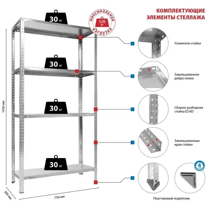 Подробное описание: Стеллаж ES 150KD/75Х30/4 оцинкованный