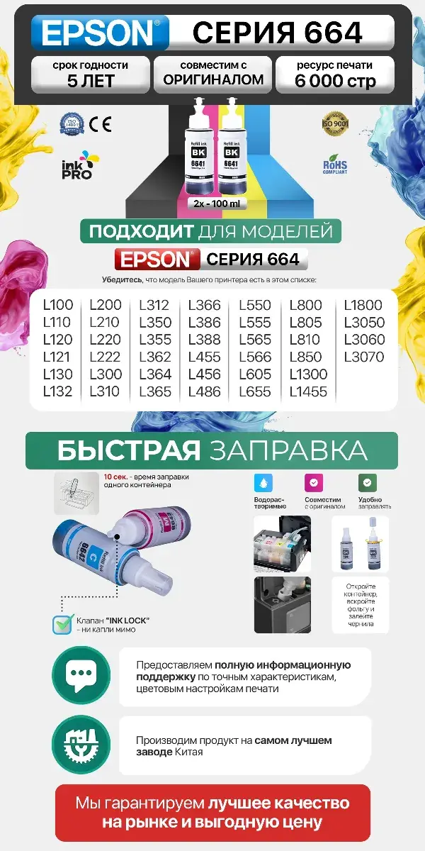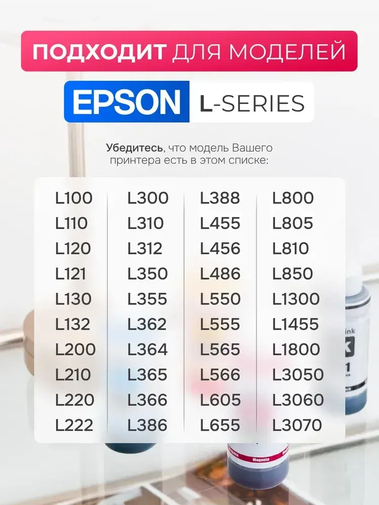 Набор красок 664 совместим с моделями принтеров EPSON серии L; L100, L110, L120, L130, L132, L200, L210, L220, L222, L270, L300, L310, L312, L350, L355, L362, L364, L365, L366, L382, L386, L455, L456, L486, L550, L555, L566, L655, L800, L805, L810, L850, L1110, L1300, L1455, L1605, L1800, L3050, L3060, L3070, XP-352, XP-342, Ecotank ET-2500, ET-2550, ET-2600, ET-2650, ET-3600, ET-4500, ET-4550, ET-14000, ET-16500 и др.