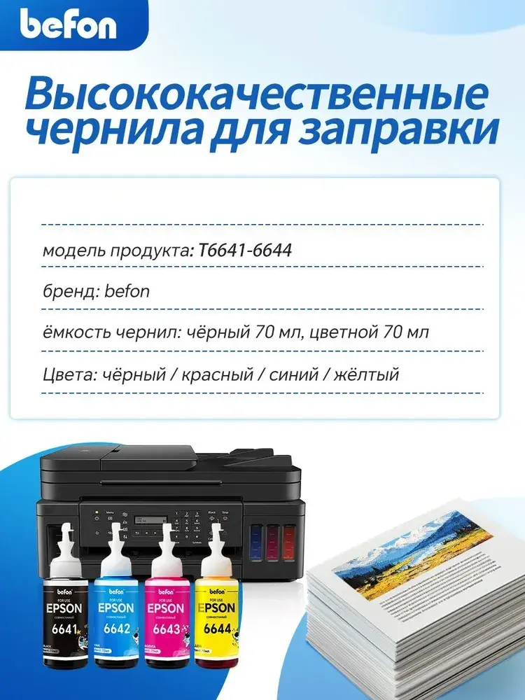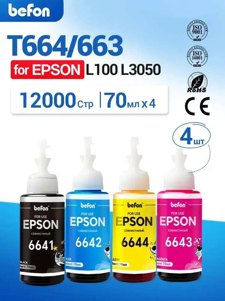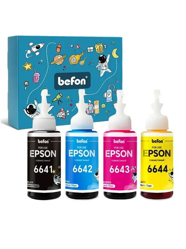 Чернила для Epson 664, комплект 4x70мл краска для принтеров L100 L110 L132 L120, L210 L222, L312 L364 L350 L355