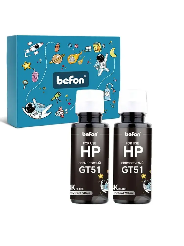 befon GT51 картриджи Multipack совместимы с: Чернила для принтеров hp, комплект высококачественных премиальных чернил befon, для принтеров HP имеет особую форму удобной крышки для заправки в принтеры серии: HP Ink Tank 110/115/119, HP Ink Tank 310/315/319, HP Ink Tank 410 / 415 / 419, МФУ HP Smart Tank 500 / 513 / 515 / 516 / 519 / 530, МФУ HP Smart Tank 615, HP DeskJet GT 5810 / 5820