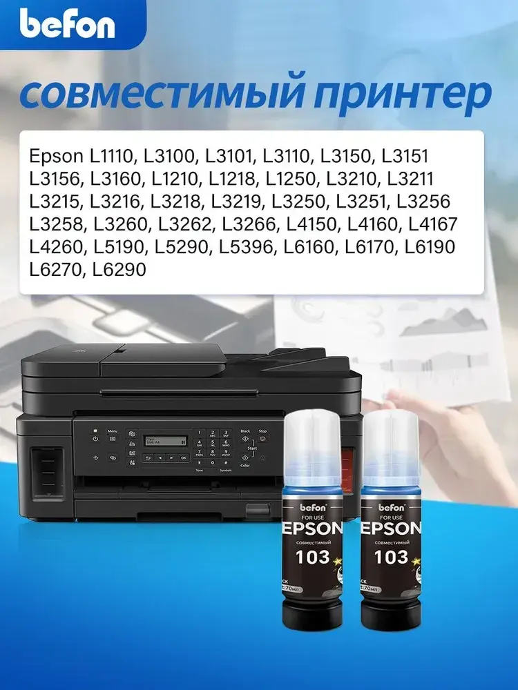 Совместим с: загрузками в принтеры Epson серии: L1110, L3100, L3101, L3110, L3150, L3151, L3156, L3160, L1210, L1218, L1250, L3210, L3211, L3215, L3216, L3218, L3219, L3250, L3251, L3256, L3258, L3260, L3262, L3266, L4150, L4160, L4167, L4260, L5190, L5290, L5396, L6160, L6170, L6190, L6270, L6290