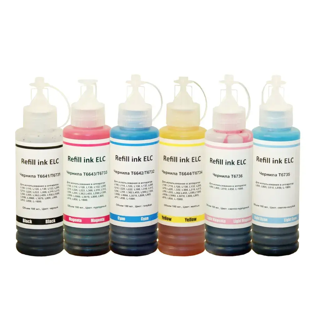 Совместимые чернила ELC для принтеров Epson в комплекте 6 цветов по 100 мл., желтый, синий, светло-синий, пурпурный, светло-пурпурный, черный.