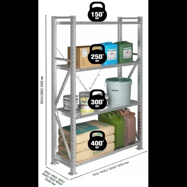 Серия MS U включает стеллажи высотой 2000, 2500 и 3000 мм, шириной 700, 1000, 1200 и 1500 мм, глубиной 300, 400, 500, 600, 800, 900 и 1000 мм.