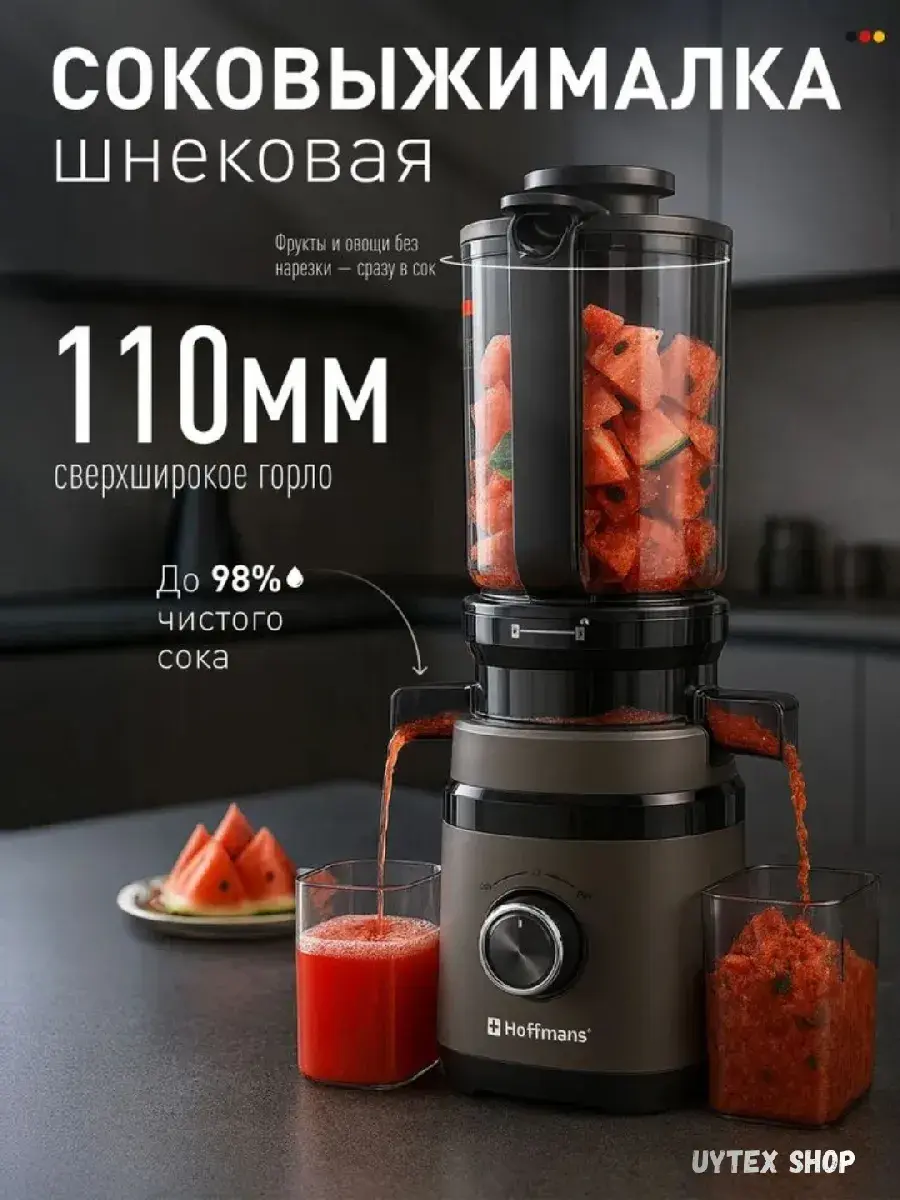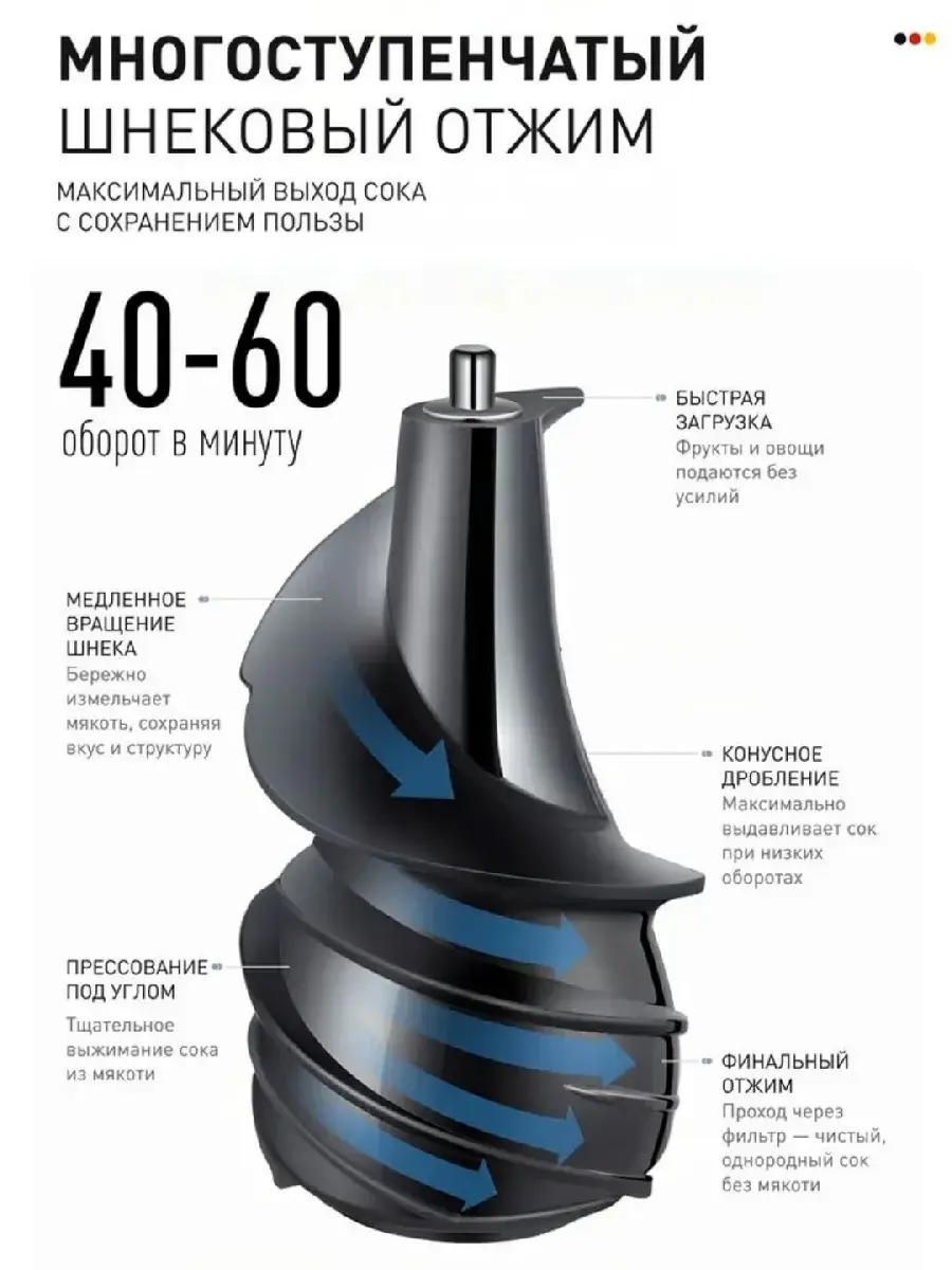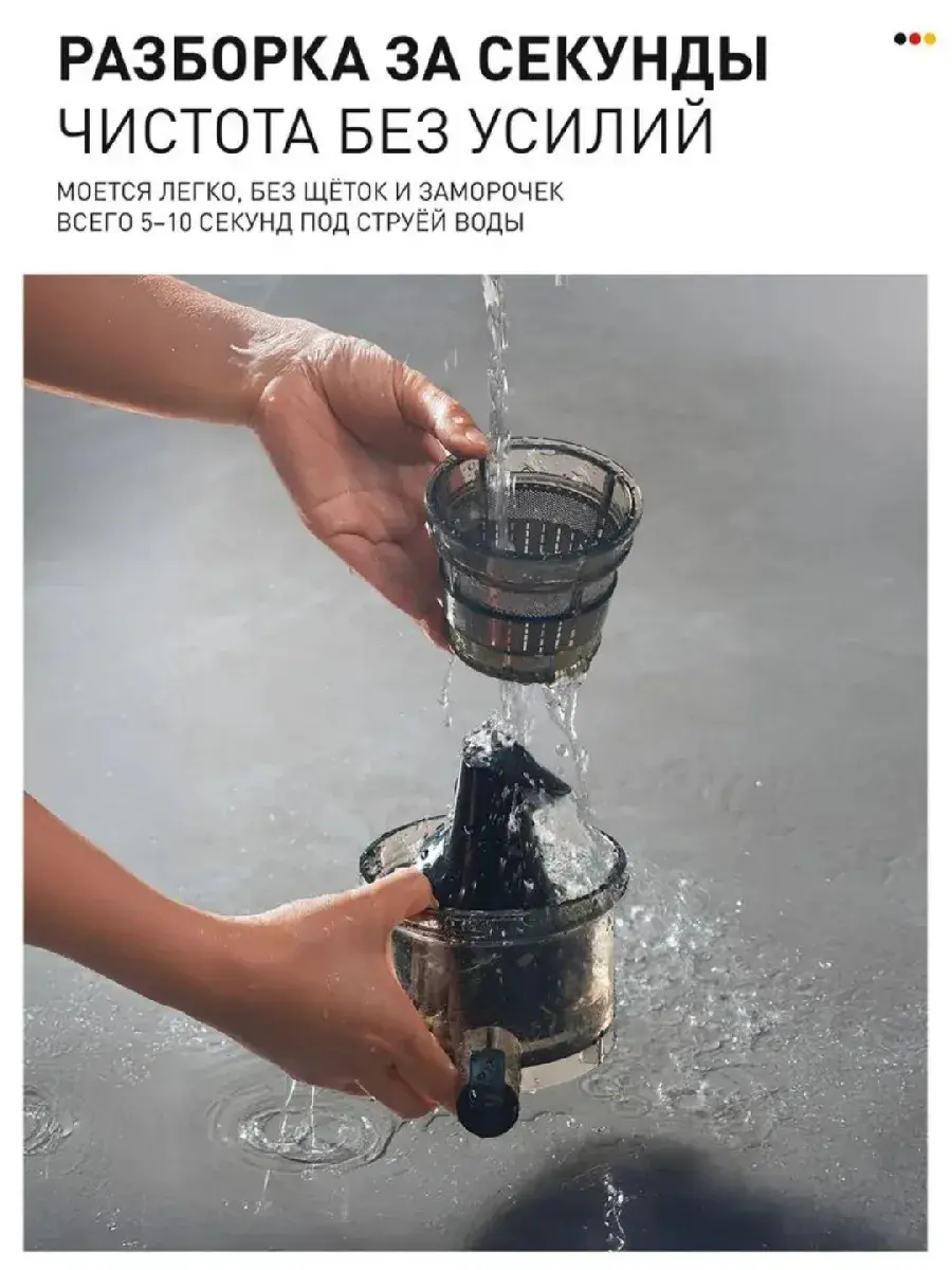 Вместительный контейнер для сока объёмом 1.5–2.0 литра и большая ёмкость для жмыха позволяют работать без частых остановок. Конструкция продумана для лёгкой очистки, что экономит время после использования.