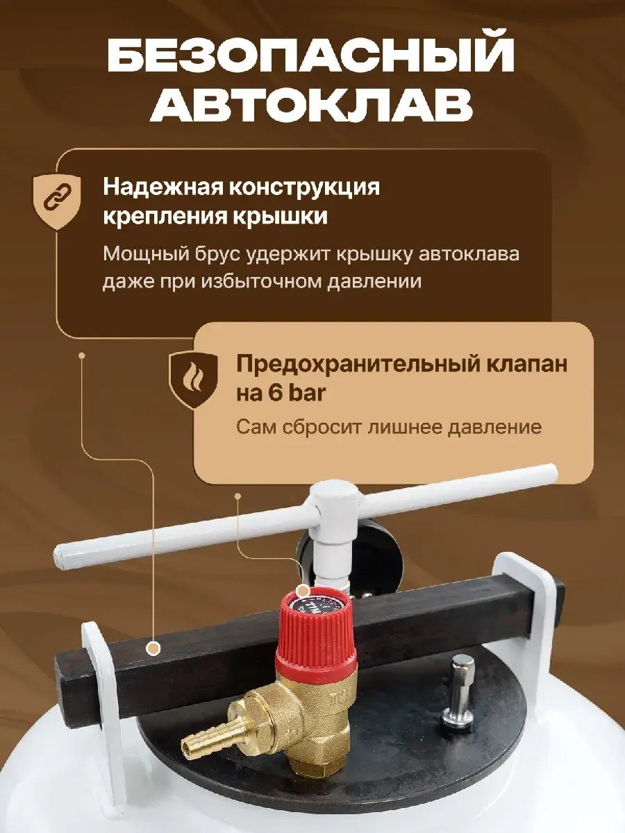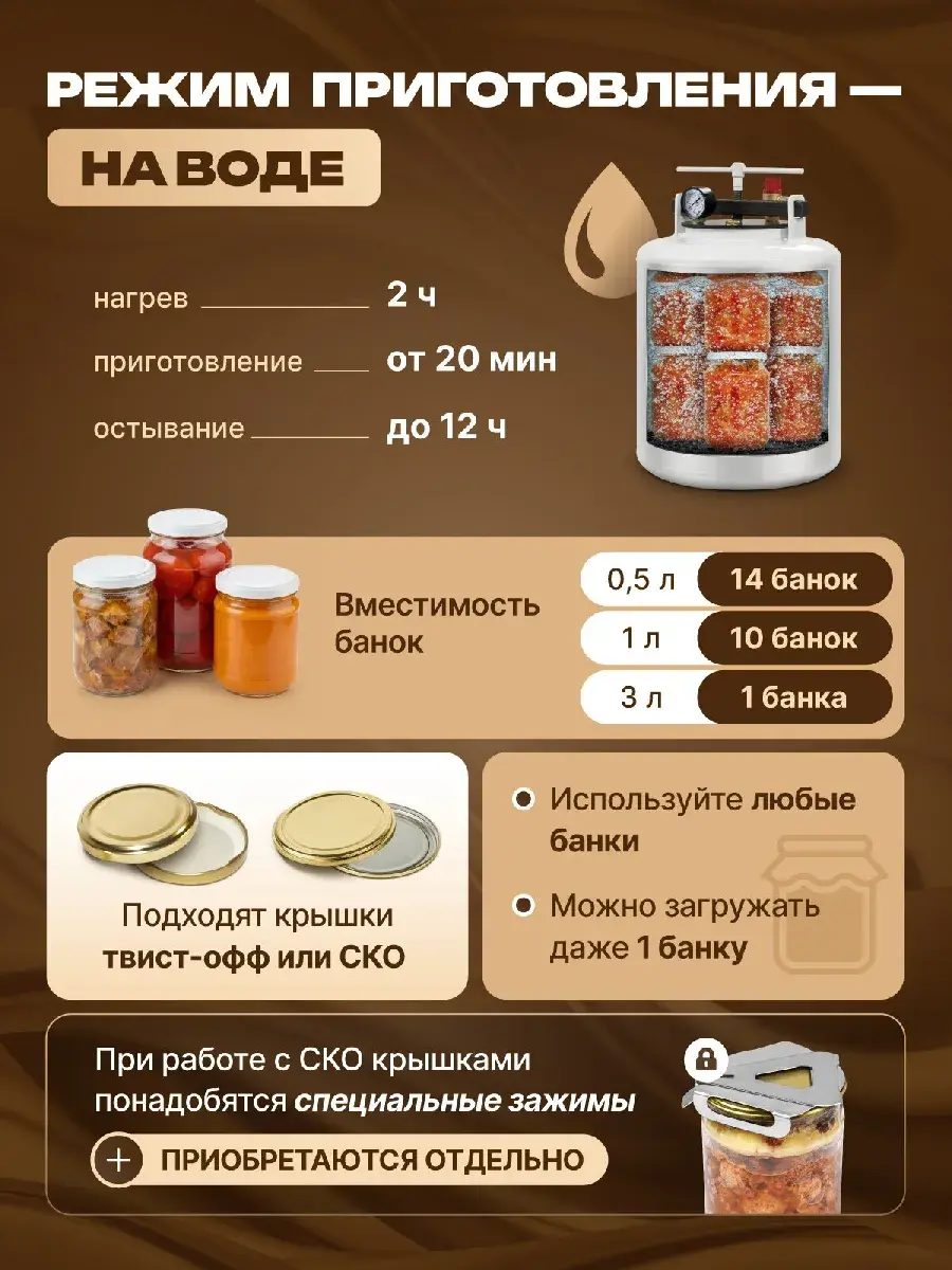 Поддерживает использование банок с крышками twist-off. Классические закаточные крышки рекомендуется применять с зажимами для автоклавирования. Также возможна готовка в реторт-пакетах.