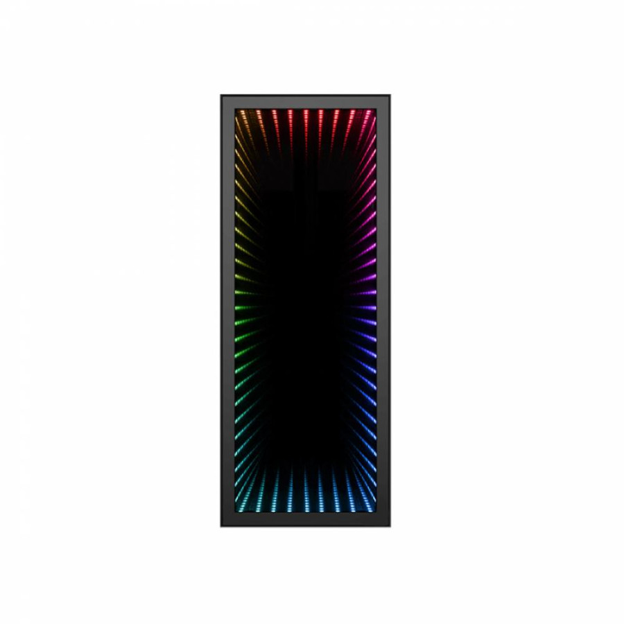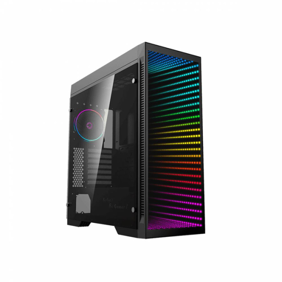 Корпус принадлежит к линейке профессиональных игровых платформ Be Gamer. Модель отличается очень вместительным шасси Full Tower и эксклюзивным дизайном. Передняя панель обладает «иллюзией бесконечности», что создается за счет работы светодиодной ленты с увлекательной ARGB-подсветкой и дополнительного зеркального отражателя. Полноразмерный корпус Gamemax Abyss TR отлично приспособлен для установки профессиональных крупногабаритных комплектующих. На шасси легко становится системная плата формата E-ATX. При построении графической системы можно использовать видеокарты длиной до 455 мм, а допустимая высота процессора — до 170 мм. Максимальная длина блока питания — 200 мм. За поддоном материнской платы есть 20 мм свободного пространства, что позволит без лишних сложностей сделать скрытую подводку абсолютно любых проводов. В корпусе имеется один предустановленный вентилятор (120 мм) c подсветкой Addressable RGB, он расположен сзади. Количество воздушных кулеров можно увеличить до семи. Платформа имеет штатный контроллер системы охлаждения и подсветки. Предусмотрена отдельная кнопка для настройки подсветки. Дополнительно есть два регулятора для настройки оптимальной скорости вращения лопастных крыльчаток. Всего к регуляторам можно подключить 5 вертушек.