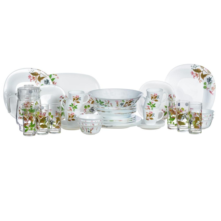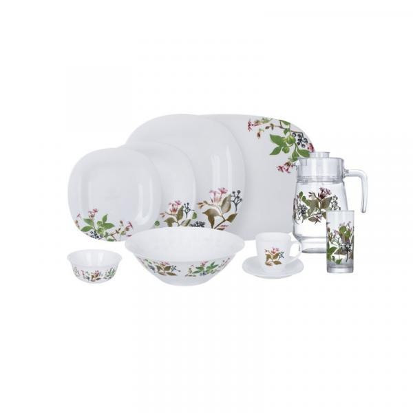 Стеклянный сервиз формы Carine с цветочным рисунком на белом фоне. Белое опаловое стекло тонкое и легкое с идеально гладкой поверхностью гигиенично, безопасно, устойчиво к сколам и агрессивным моющим веществам. Рисунок нанесен надежно, защищен и не сцарапывается. Сохраняет идеальный внешний вид после многих циклов мытья в посудомоечной машине. Идеально подходит для ежедневного использования.Стандартный набор тарелок удачно дополнен питьевым набором: кувшин и 6 высоких стаканов с рисунком. Блюдо удобно для подачи сладостей, пирожков, пирожных или бутербродов.