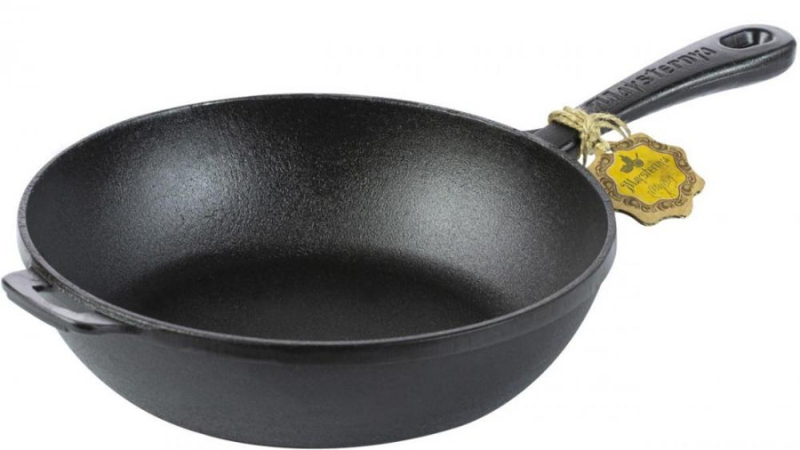 Сковорода чугунная литая 24 см с деревянной ручкой Maysternya (Майстерня). Перед первым использованием чугунную посуду необходимо прокалить на сильном огне 15-20 минут, до прекращения выделения дыма, затем остудить, причём можно и под проточной водой. Далее необходимо прокалить сковороду с солью (предварительно засыпав 2-3 столовые ложки), прожаривать на огне, перемешивая, на протяжении 3-5 минут, дать остыть и в завершение промазать всю поверхность подсолнечным маслом. И внутри и снаружи. Ваша посуда готова к использованию на всех видах плит и на открытом огне. Будет служить долго как в домашнем обиходе, так и на профессиональной кухне. После использования чугунную посуду следует насухо протереть либо высушить на плите.