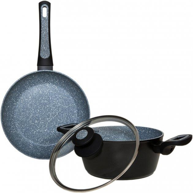 Серия выполнена из кованого алюминия покрытого устойчивым антипригарным мраморным покрытием Marble Grey - которое имеет высокие антипригарные свойства, устойчивое к царапинам и перепада температур. Бакелитовые ручки изделий не нагреваются и покрытые приятным на ощупь покрытием soft-touch и декоративными вставками под мрамор. Серия имеет индукционный диск, то есть подходит для всех видов плит.