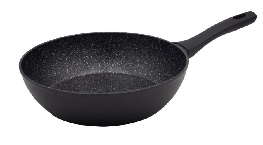Серия выполнена из кованного алюминия покрытого стойким антипригарным мраморным покрытием черного цвета Megastone – это новое поколение многослойных «шершавых» покрытий, в несколько раз превышающих показатели прочности традиционных антипригарных покрытий. Внешнее покрытие чёрного цвета - легкое в уходе, стойкое к царапинам и открытому огню.