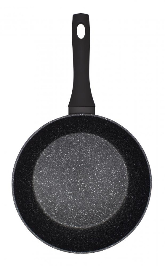 Серия выполнена из кованного алюминия покрытого стойким антипригарным мраморным покрытием черного цвета Megastone – это новое поколение многослойных «шершавых» покрытий, в несколько раз превышающих показатели прочности традиционных антипригарных покрытий. Внешнее покрытие чёрного цвета - легкое в уходе, стойкое к царапинам и открытому огню.