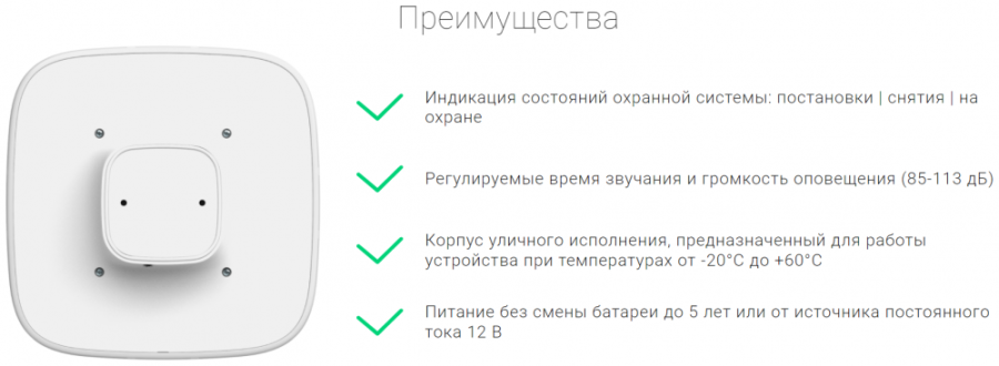 Беспроводная светозвуковая сирена с настраиваемым уровнем громкости звука от 85 дБ до 113 дБ. Предназначена для установки на улице.