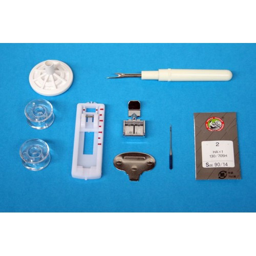 чехол, документация, лапки, шпульки, отвёртка, иглы, диск DVD, нож для прорезания петель, колпачок для катушки