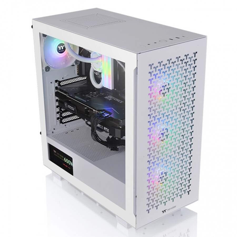 Thermaltake V350 TG ARGB Snow Air разработан для систем, которым нужна максимальная вентиляция. Основной ососбенностью корпуса яляется перфорированная передняя панель с множеством вырезов в форме букв "Т". С завода V350 TG ARGB Air Snow оснащен тремя 120-мм вентиляторами ARGB спереди и одним 120-мм стандартным вентилятором сзади для обеспечения максимальной эффективности охлаждения. V350 TG ARGB Air Snow ATX Mid Tower прекрасно подойдет как для геймеров, энтузиастов, так и пользователей выполняющих повседневные задачи. Левая боковая панель корпуса V350 TG ARGB Air Snow выполнена из закаленного стекла толщиной 4-мм, которое толще и устойчивее к царапинам по сравнению со стандартным акрилом. Кроме того, через него отлично видно всю красоту комплектующих, особенно при включенной RGB подсветке. При желании, видеокарту можно установить лицом к боковой панели при помощи специального кронштейна, который фиксируется на кожухе для блока питания. При таком сценарии исключается возможность провисания видеокарты и нагрузка на слот PCI-E материнской платы. Кожух для блока питания позволяет улучшить вентиляцию внутри корпуса и спрятать неиспользуемые кабели.