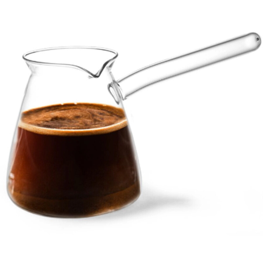 • Благодаря жаропрочному стеклу турку можно использовать на газовых и электрических плитах