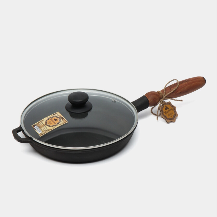 Сковорода чугунная литая с деревянной ручкой со стеклянной крышкой Maysternya Т302С3, 24 * 4 см