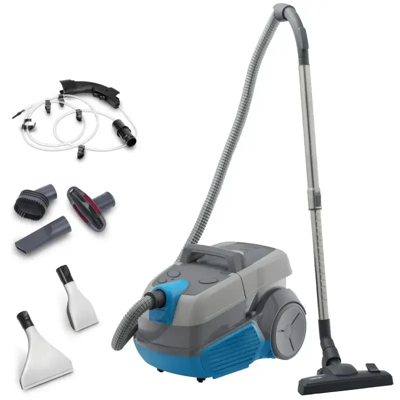 В комплект входят все необходимые аксессуары: универсальная щётка 2-в-1, насадка для мягкой мебели, щелевая насадка и гибкий шланг. Для удобства предусмотрены телескопическая труба и автоматическая смотка кабеля.