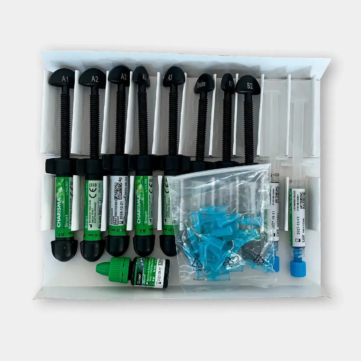 Charisma Smart — это рентгеноконтрастный гибридный композит с микроструктурой (частицы Microglass размером до 10 мкм), предназначенный для реставраций с естественными оттенками и адгезивной фиксацией. Подходит для передних и жевательных зубов.