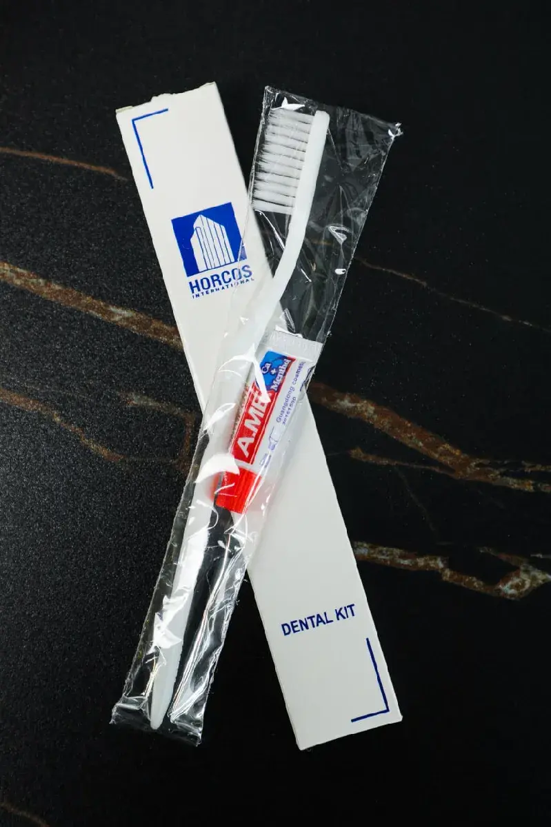 Зубной набор для гостиниц представлен в белой картонной коробке. Объем зубной пасты составляет 3 г, что позволяет использовать ее дольше.