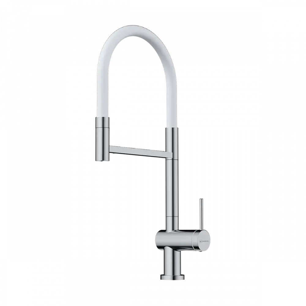 Смеситель оснащён вытяжным шлангом, который значительно упрощает мытьё посуды и рабочей зоны, а также возможностью подключения фильтра для питьевой воды. Плавная работа керамического картриджа обеспечивает комфортное управление напором и температурой воды. Универсальный хромированный цвет легко вписывается в любой интерьер кухни.