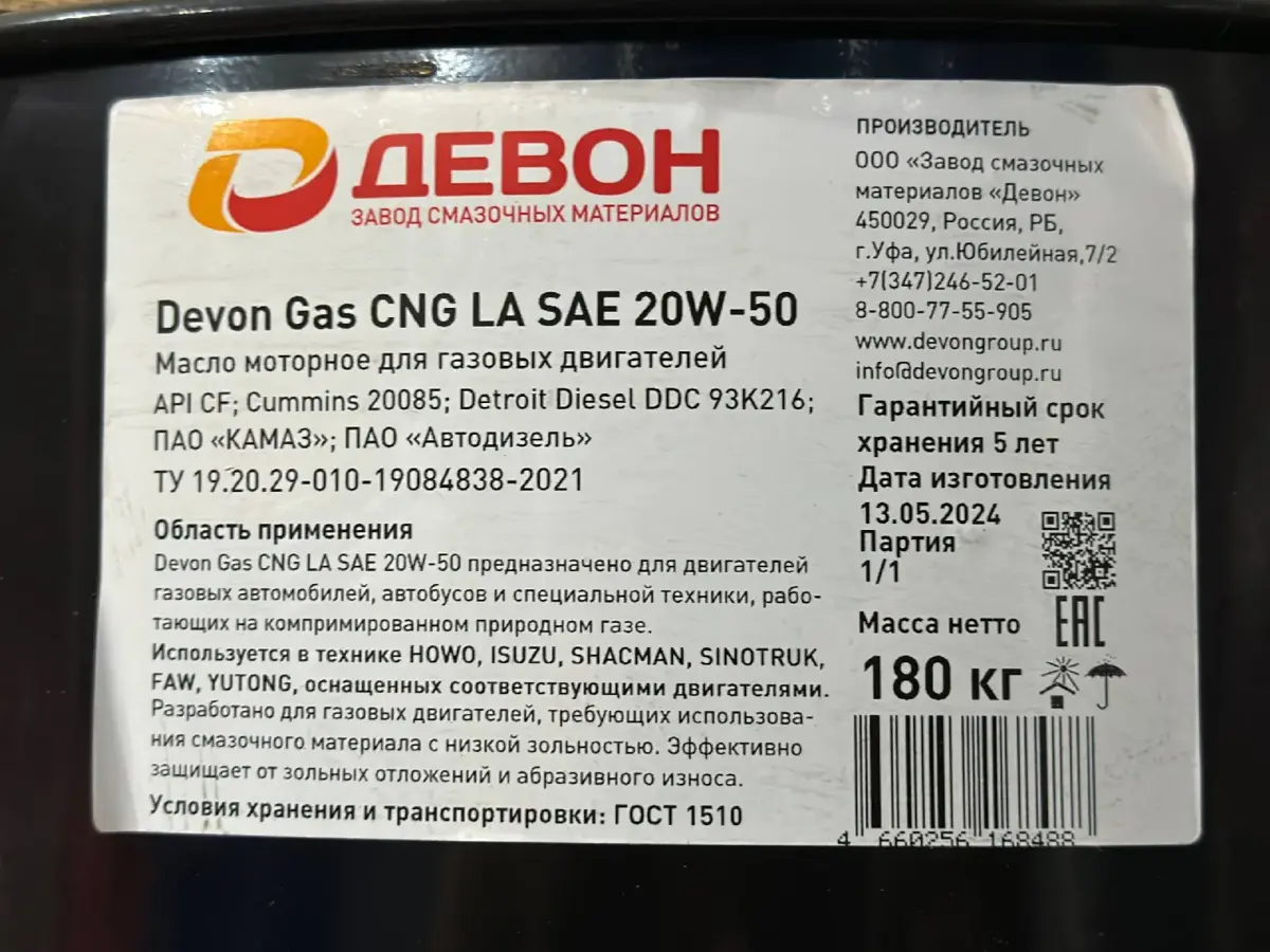 Batafsil tavsif: Motor moyi DEVON Gas CNG LA SAE 20W-50 (205l)