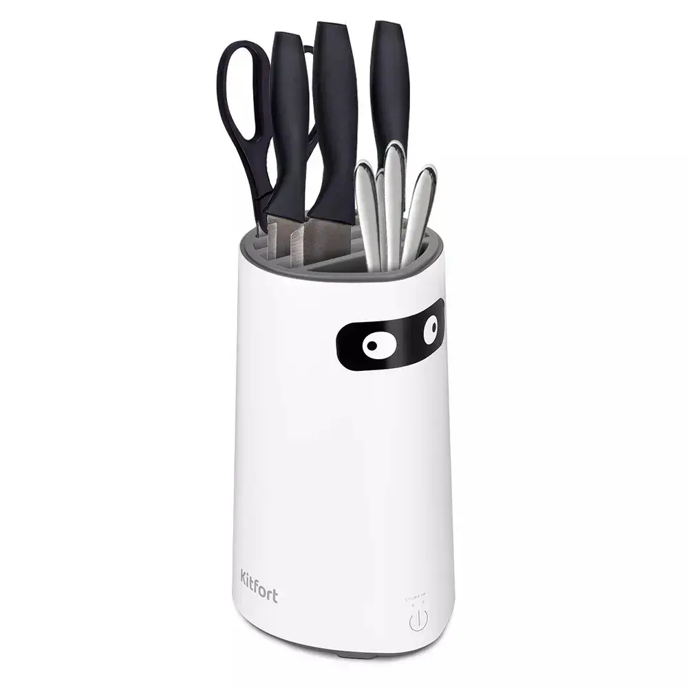 Стерилизатор для ножей Kitfort КТ-2055 — настольное устройство для ультрафиолетовой стерилизации и сушки столовых приборов. Подходит для ножей, вилок, ложек, ножниц и других кухонных инструментов. Особенно актуален для семей с детьми и при частой работе с сырым мясом и рыбой.