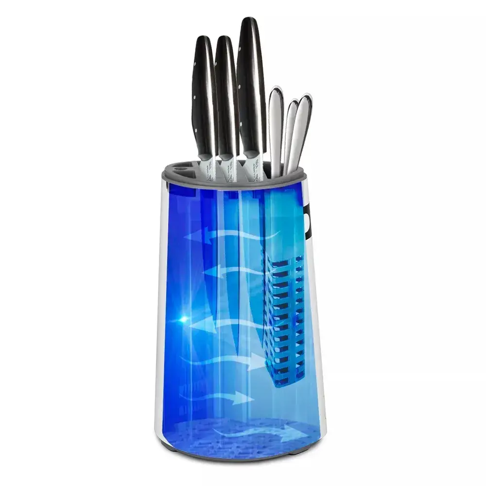 — Дезинфекция ножей после разделки мяса и рыбы — Одновременная стерилизация и сушка — Поддержание гигиены на кухне — Компактный размер и современный дизайн