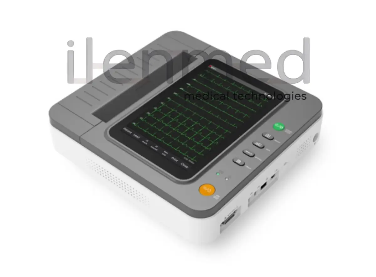 Мощный цифровой 12-канальный ЭКГ-аппарат с большим цветным экраном и встроенным принтером, предназначенный для качественной регистрации, анализа и хранения электрокардиограмм с автоматической обработкой данных.