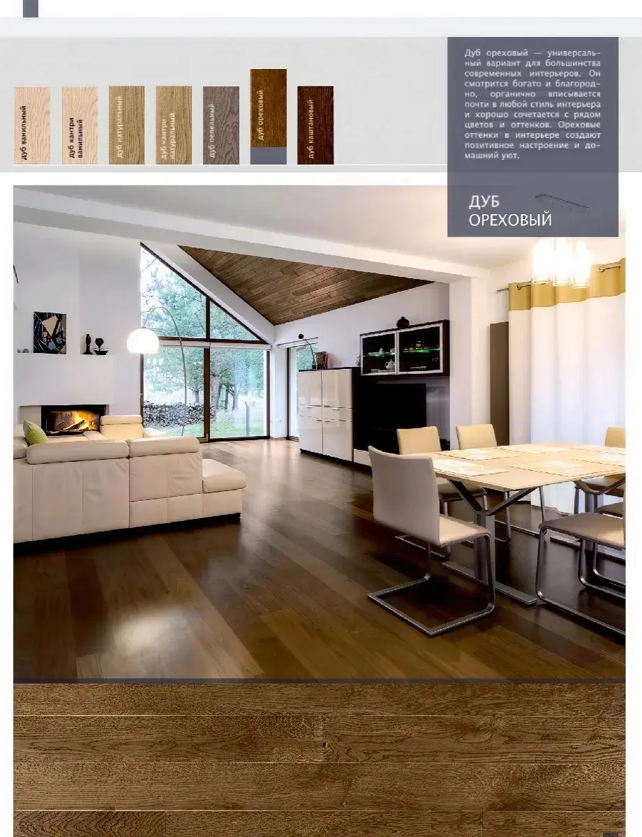 Паркет из дуба в ореховом оттенке — универсальное решение для современных интерьеров. Глубокий тёплый цвет придаёт помещению ощущение уюта, роскоши и гармонии. Отлично сочетается со светлой мебелью и современными дизайнерскими решениями.
