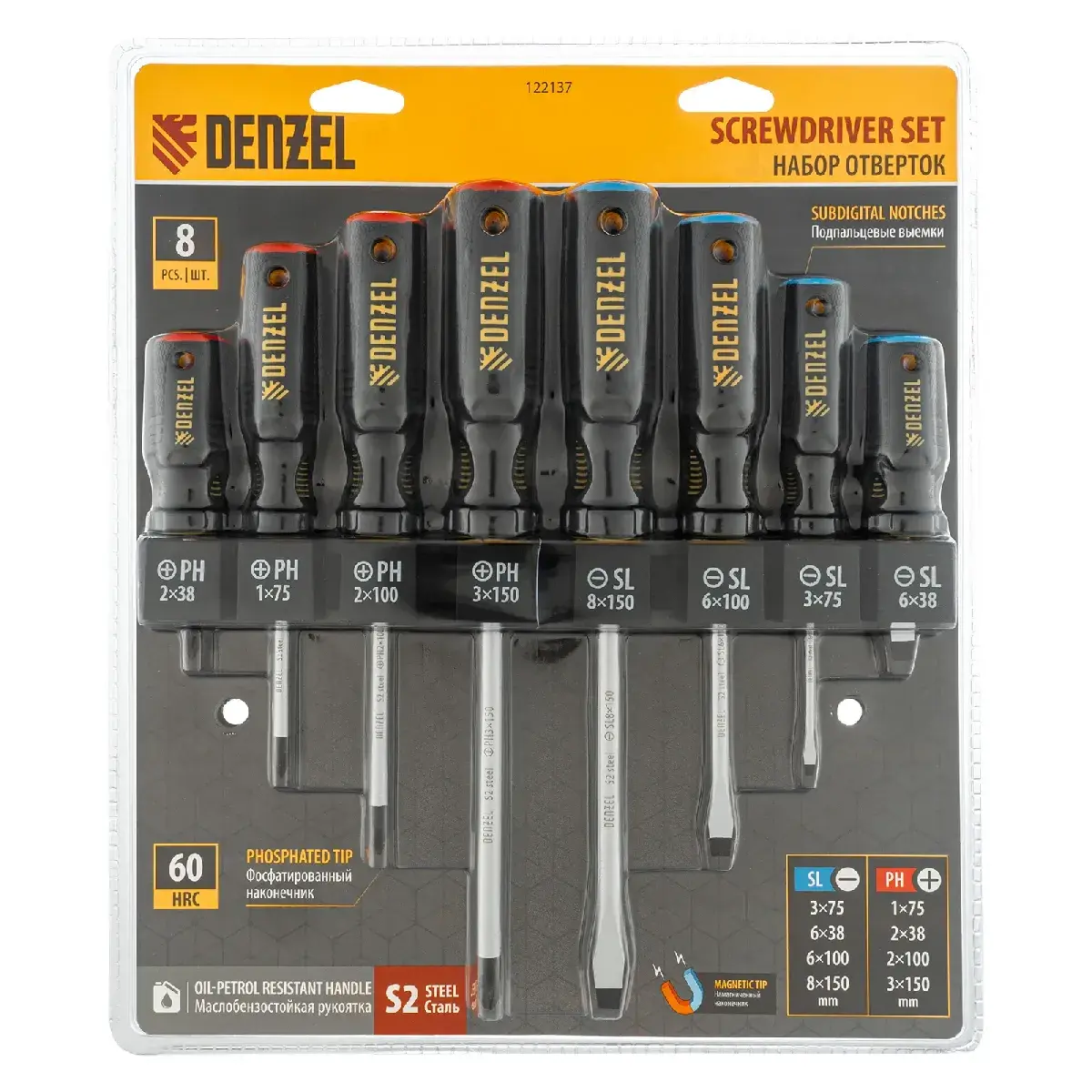 Batafsil tavsif: Denzel javondagi 8 qismli tornavida, PH+SL, S2, 3 tugunli tutqich