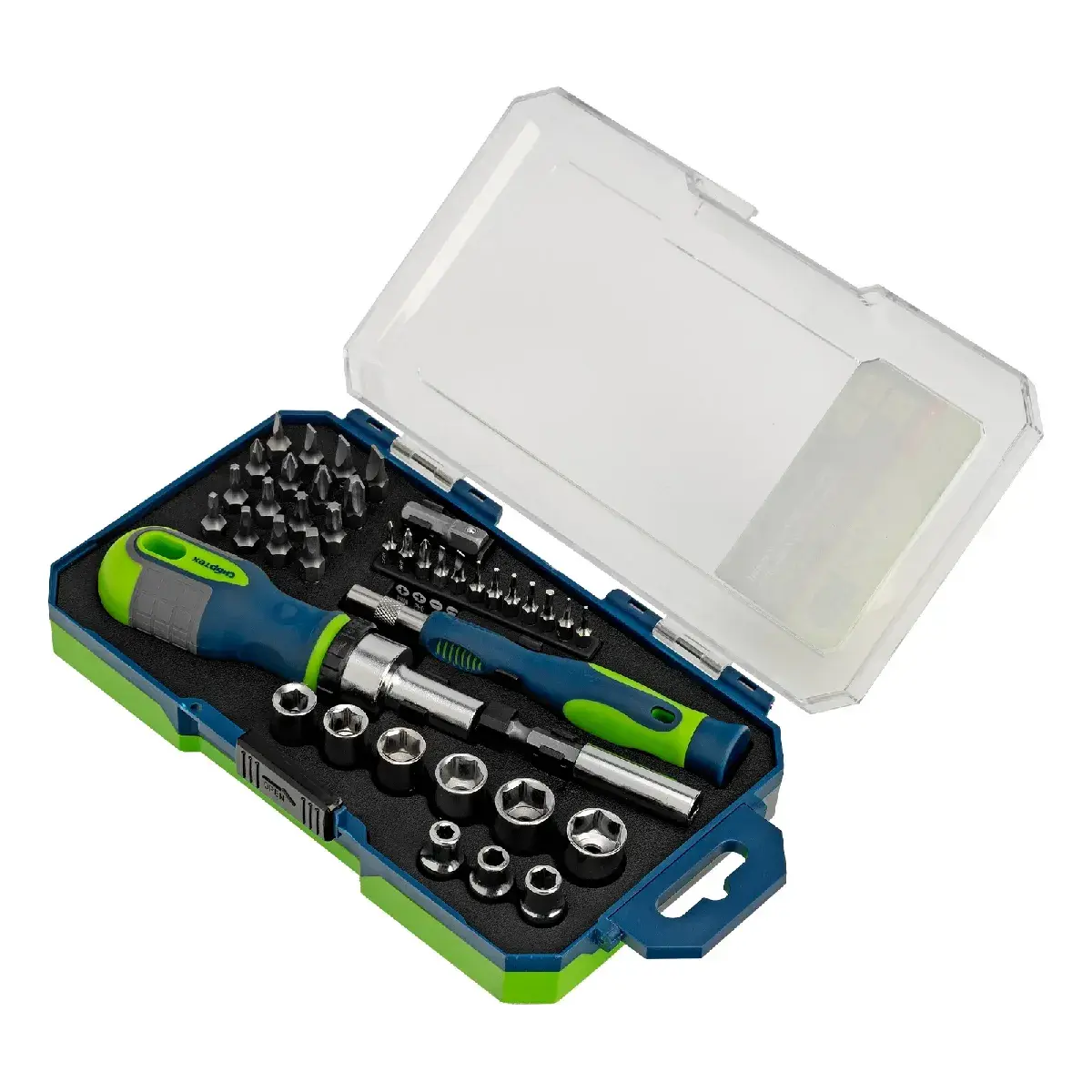 Batafsil tavsif: Bit va rozetka boshlari to'plamiga ega qaytib tornavidalar, 41 dona, CrV. Sibirtech