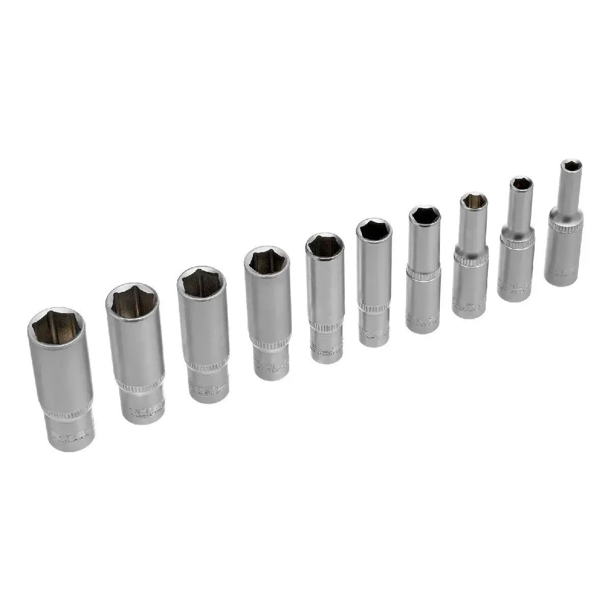 Batafsil tavsif: Kengaytirilgan 1/4" rozetka boshlari to'plami, 6 nuqtali, CrV, 10 dona, 4-13 mm. Stels