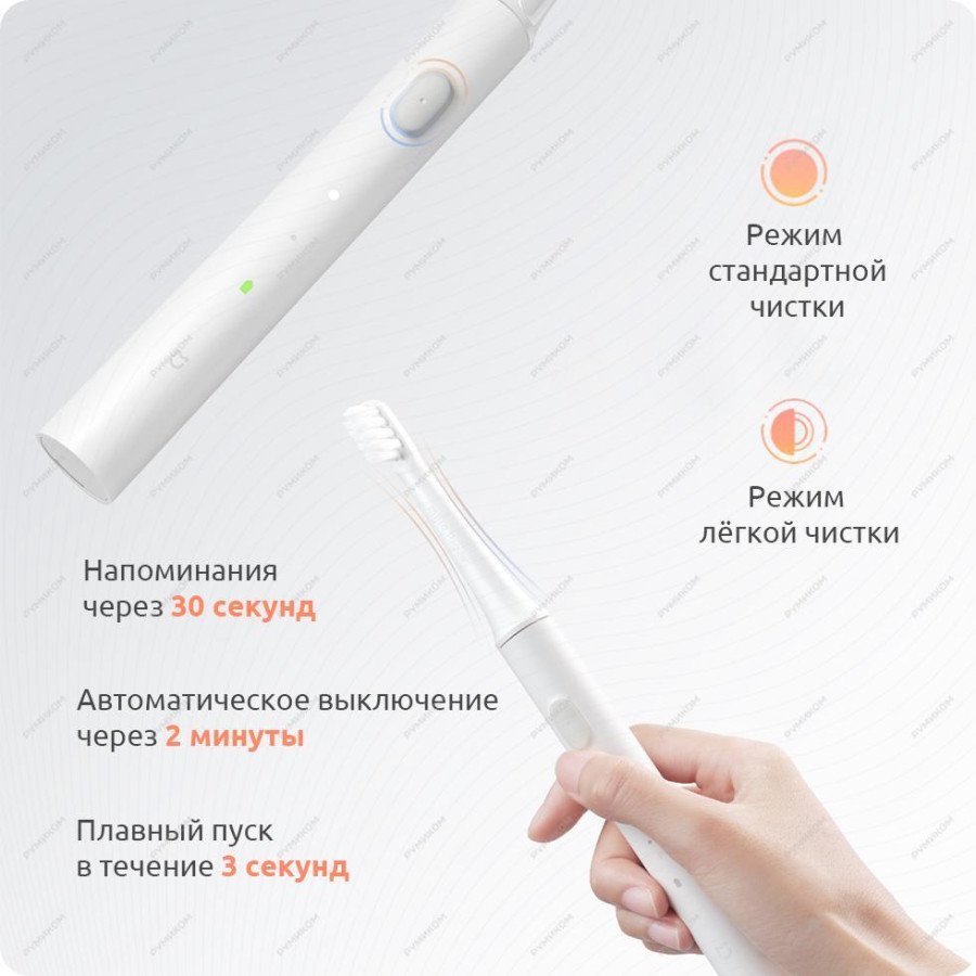 Компактная и легкая звуковая электрическая зубная щетка с стильным дизайном, превращает уход за зубами в удовольствие. Мощность 16500 оборотов в минуту, в 7 раз эффективнее обычной щетки, улучшает состояние десен, осветляет зубы в 2 раза быстрее.\\n\\nЗубная щетка Xiaomi Mijia Sonic Electric Toothbrush T100 в водонепроницаемом корпусе. Соответствует стандарту влагозащиты IPX7, поэтому допускается мытье под проточной водой. Пластиковый корпус с прорезиненным покрытием обеспечивает надежное удержание девайса в руке.