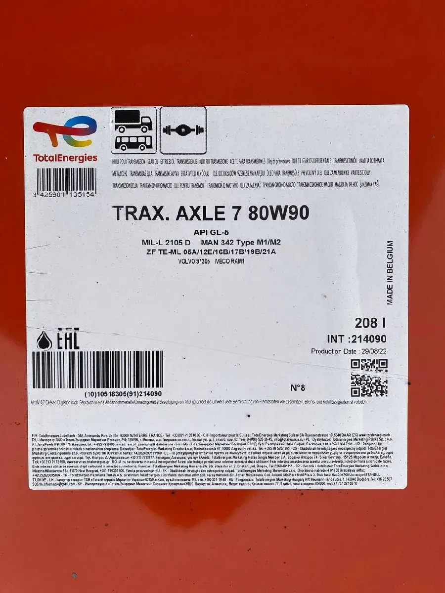 TOTAL TRANSMISSION AXLE 7 80W-90 минеральное масло с высокими противозадирными свойствами для смазки тяжелонагруженных зубчатых передач (дифференциалов, конечных передач, коробок отбора мощности, планетарных передач) с уровнем свойств API GL-5. TOTAL TRANSMISSION AXLE 7 80W-90 рекомендуется для применения в гипоидных передачах ZF и MAN со стандартным интервалом замены.