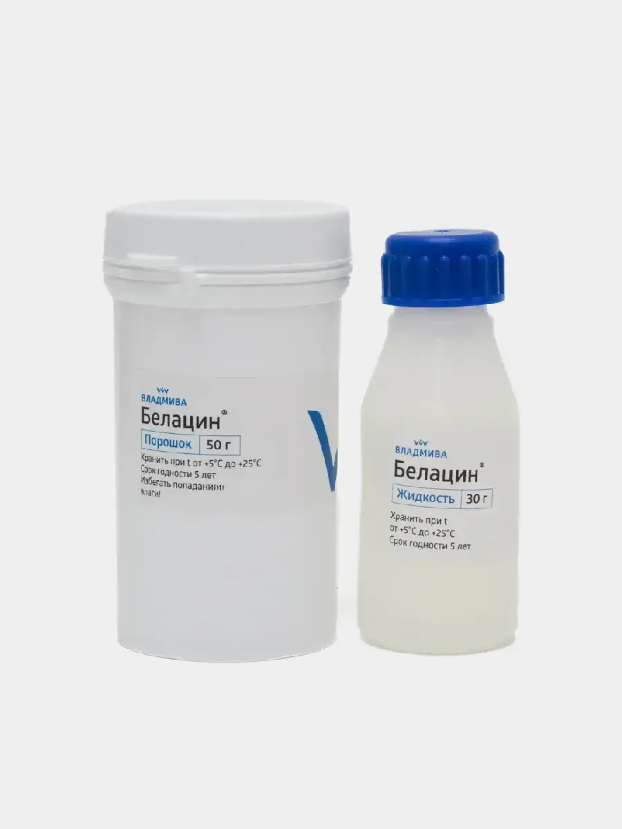 Порошок представляет собой тонко измельченное алюмосиликатное стекло с добавками фторидов, что снижает растворимость прилегающей к пломбе эмали. Жидкость содержит ортофосфорную кислоту сниженной активности. По блеску, цвету и прозрачности пломбы, изготовленные из цемента "Белацин", превосходно воспроизводят ткани зуба и соответсвуют всем эстетическим требованиям.