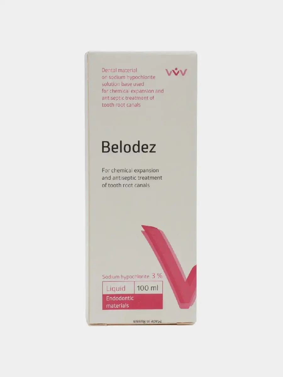 Стоматологический материал "Белодез" на основе стабилизировнного раствора гипохлорита натрия предназначен: 3% раствор (гель) для медикаментозной обработки корневых каналовв качестве бактерицидного, кровостанавливающего и отбеливающего средства, для химического расширения каналов в сочетании с растворами ЭДТА, а также для дезинфекции полости зуба.